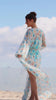 The turquoise bikini, with a structured design and front detailing, brings character and a modern edge, while the long floral mesh kimono adds movement, lightness, and a romantic feel that gracefully envelops the silhouette.