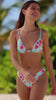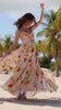 The delicate floral bikini enhances the silhouette with a soft, flattering fit, while the flowing maxi skirt, adorned with vibrant blooms, drapes gracefully and moves with every step.