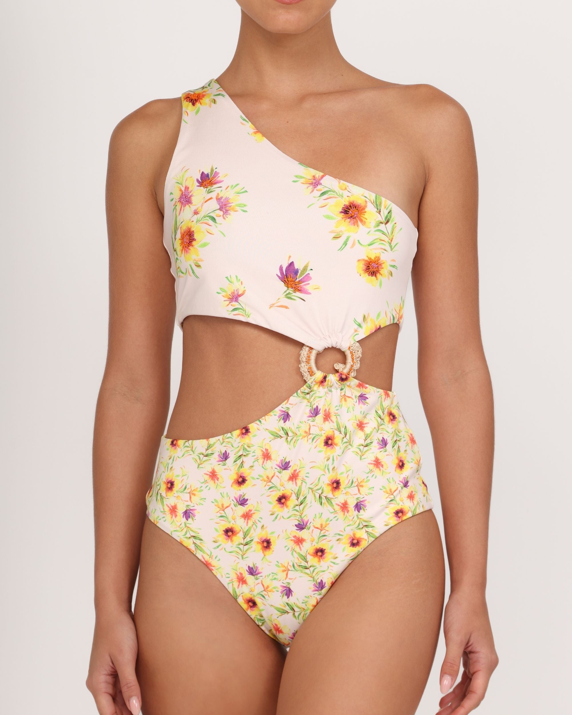 The central decorative ring adds an artisanal touch, elevating this swimsuit into a sophisticated and eye-catching design. Crafted from soft lycra with an exclusive floral print over a sand-toned base, it offers comfort, support, and style in one timeless piece.